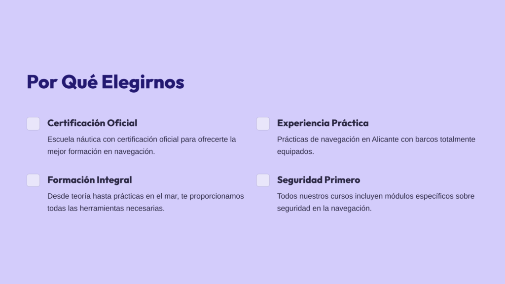 Escuela de navegación en Alicante con experiencia: «Con más de [X] años de experiencia, nuestra escuela de navegación en Alicante se ha convertido en un referente en la formación náutica. Ofrecemos cursos de alta calidad para que puedas disfrutar del mar con total seguridad.»